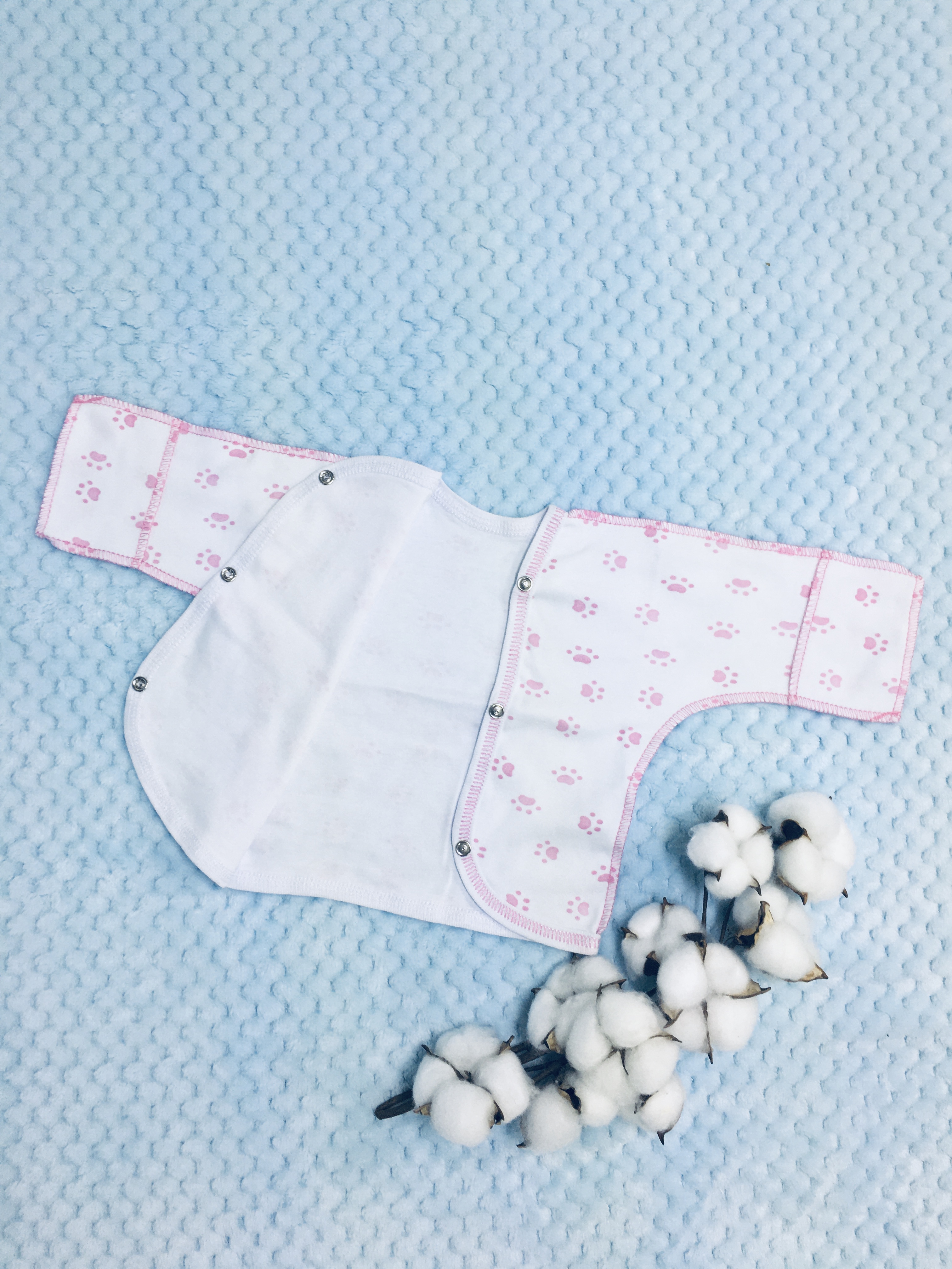 Распашонка выполнена со швами наружу, с рукавчиками-трансформерами, спереди с асимметричной застёжкой на кнопочках.